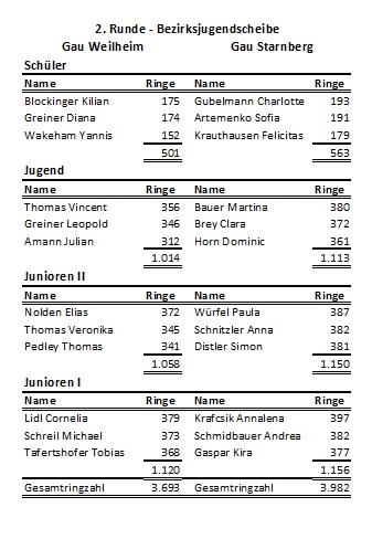 Eine hervorragende Leistung lieferte der Schützennachwuchs des Gaus Starnberg in der zweiten Runde des Bezirkspokals „Bezirksjugendscheibe“ in Polling gegen den Gau Weilheim ab. In den Klassen Schüler, Jugend, Junioren 1 und Junioren 2 traten die jeweils 3köpfigen Mannschaften gegeneinander an und die Starnberger Auswahl konnte alle vier Wettbewerbe mit einem Endergebnis von 3.693 : 3.982 Ringen deutlich für sich entscheiden. Eine starke Truppe, die sich auf die nächste Runde freut, wir drücken die Daumen.